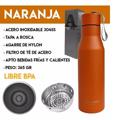 BOTELLA TERMICA EXPLORER 750 ML ACERO INOXIDABLE DEPORTIVA 123268001 - NARANJA Botella Deportiva Térmica Ideal Agua Gym Camping Pesca Salidas!!! La botella térmica T8 de Explorer Apolo, soporta todo tipo de bebidas frías o calientes hasta un máximo de 24 hs, y 120 horas el hielo. Ideal para quienes ...