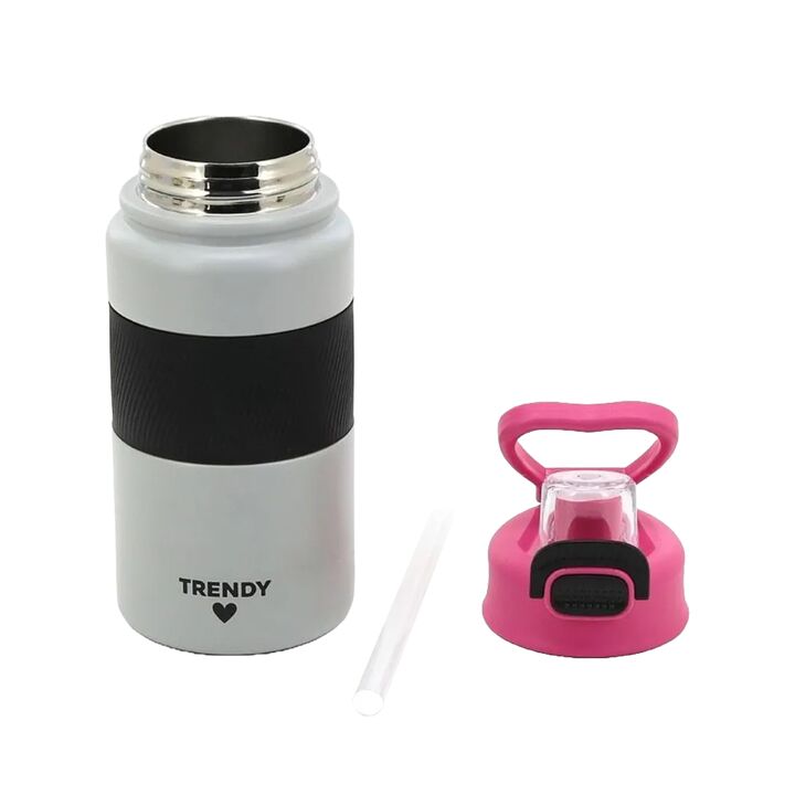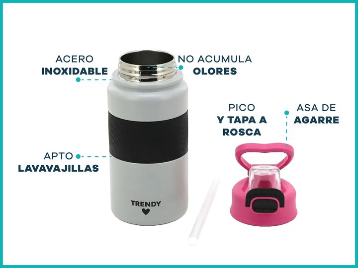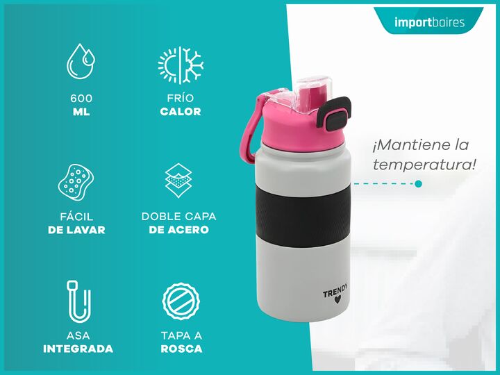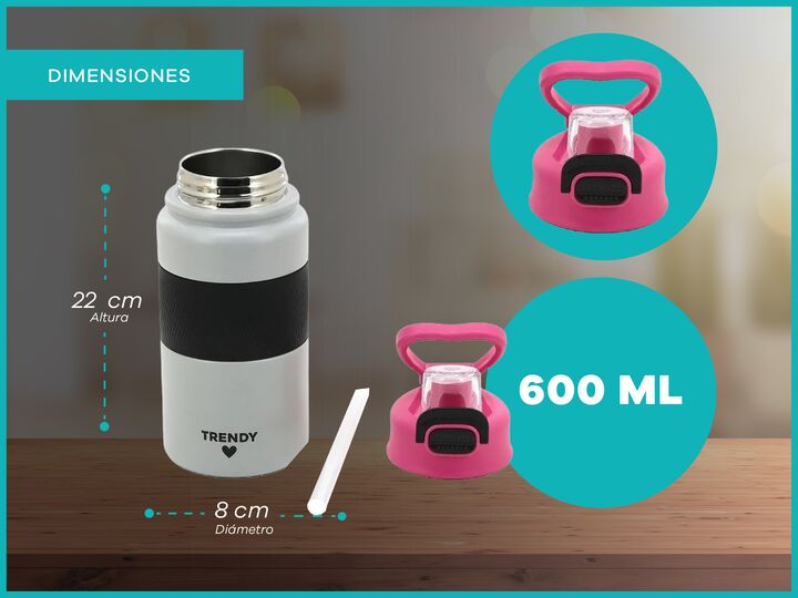 BOTELLA TRENDY TERMO DEPORTIVA APERTURA AUTOMATICA · Posee una Capacidad de 600 ml · Apertura automática por botón · Incluye bombilla para usar como sorbete · Pico vertedor o cebador de polipropileno: · Cuerpo antideslizante · A prueba de fugas · Acero inoxidable · Interior de acero inoxidable 304 d...