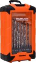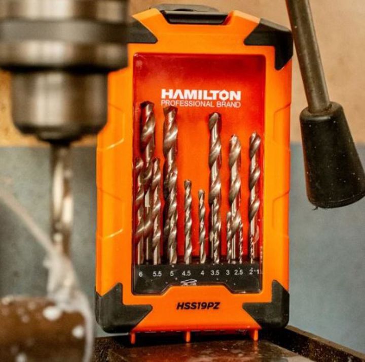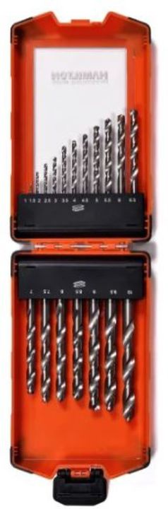 BROCA SET 19 PIEZAS HSS19PZ HAMILTON Juego de Brocas 19 PIEZAS # Fabricada bajo normas DIN338-N con acero M2. # Dureza: > 60 HRC. # Filo cruzado. # Medidas: 1, 1.5, 2, 2.5, 3, 3.5, 4,4.5, 5, 5.5, 6, 6.5, 7, 7.5, 8, 8.5, 9, 9.5, 10 mm. # Origen Francia. -Garantía 24 meses