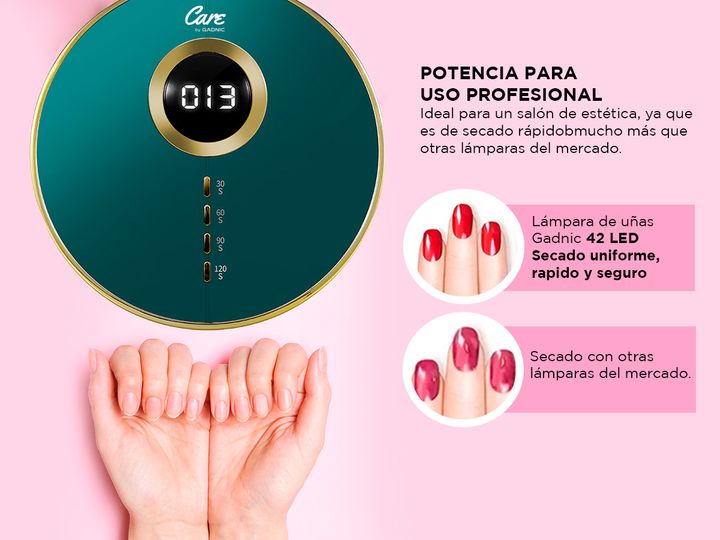 ¡Nueva lámpara de uñas Gadnic de alta potencia y secado rápido! Función de secado inteligente El secado inteligente consiste en la elección de la duración del secado desde 30, 60, 90 o 120s, una vez transcurrido el tiempo indicado la lámpara se apaga automáticamente. Las sesiones de 90 y 120s son de...