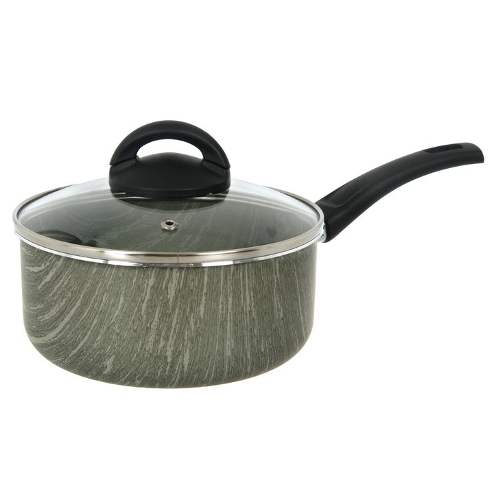 Cacerola de 18 cms con tapa de vidrio templado y orificio para salida de vapor. Batería de cocina de Aluminio recubierto de laca resistente a alta temperatura en su parte externa y Antiadherente en su interior con mango tipo baquetita negro Espesor : 1,8 mm Capacidad : 1,85L / diámetro: 18 cm / larg...