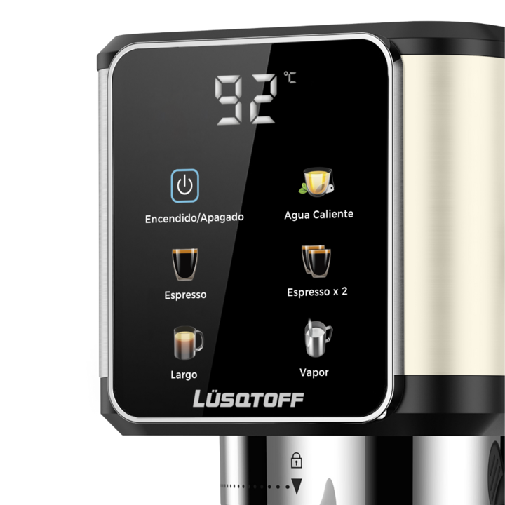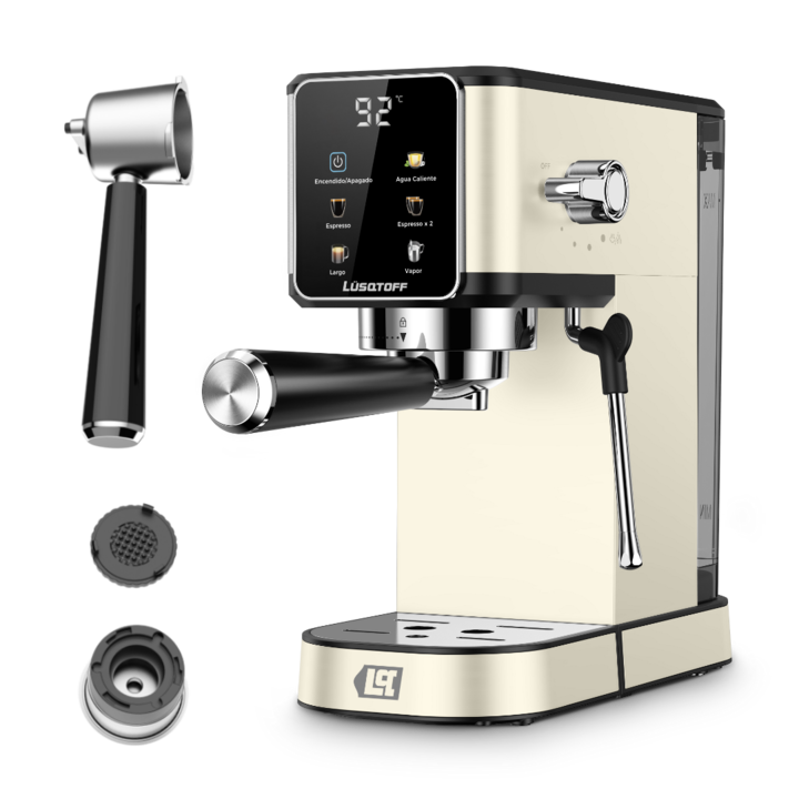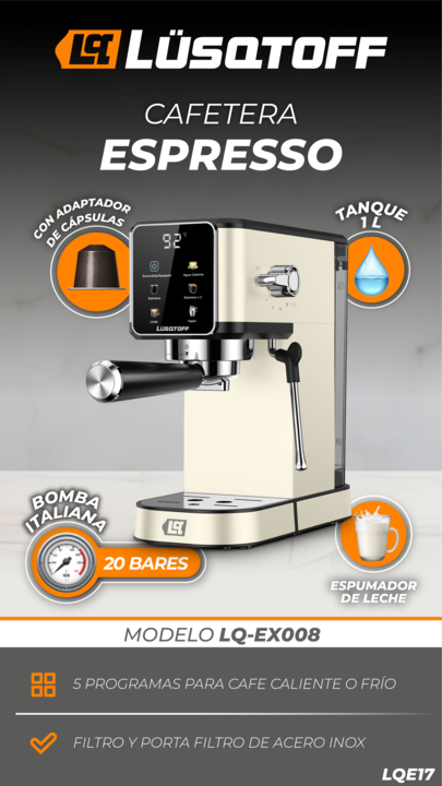 Cafetera espresso – Bomba italiana de 20 bares – Tanque de 1 litro – Espumador de leche – 5 programas para café caliente o frío – Con adaptador de cápsulas – Filtro y porta filtro de acero inoxidable.
