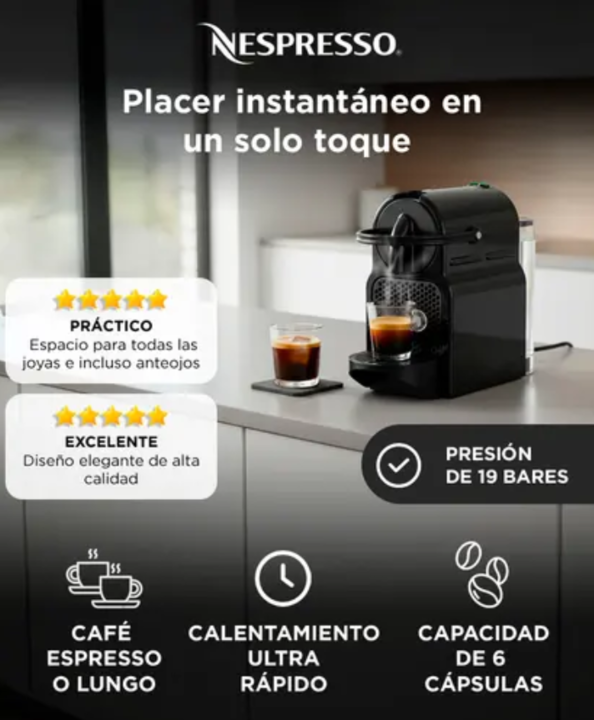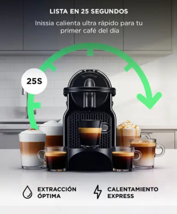 Extracción profesional: 19 bares de presión para café con cuerpo, aroma y crema en segundos. Listo en 25 segundos: Calienta al instante tu primera taza del día. Diseño compacto y liviano: Solo 2,4 kg y 12 cm de ancho para espacios reducidos. Espresso o Lungo personalizable: Dos botones programables ...
