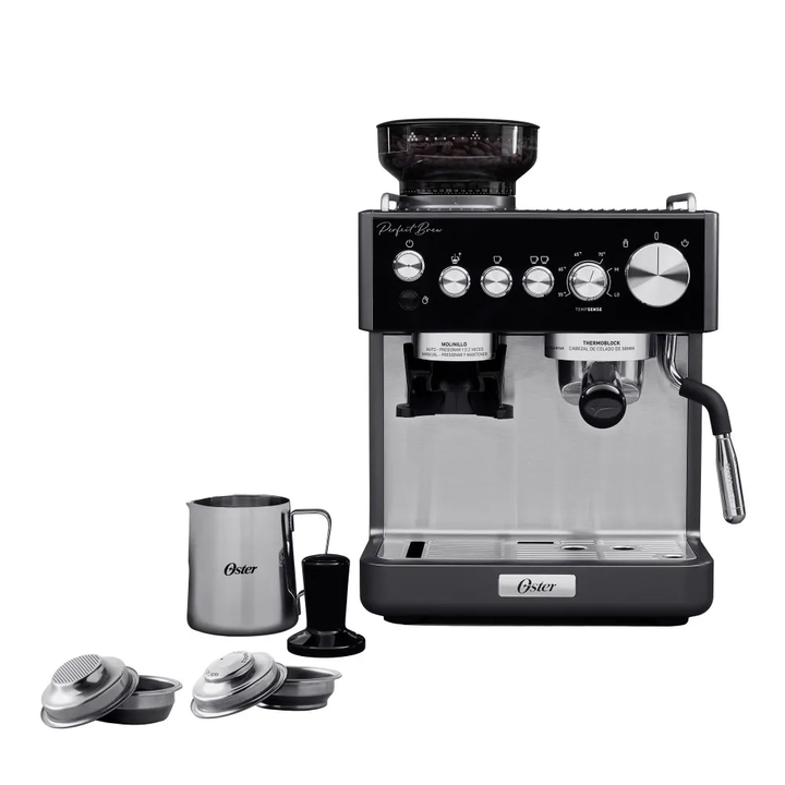 Cafetera Espresso Oster® Perfect Brew – Con molinillo integrado y tubo de vapor Tempsense™ La cafetera espresso Oster® Perfect Brew te ofrece la experiencia de una cafetería en tu casa, con resultados profesionales en solo tres pasos: Molienda precisa y sin derrames: Su molinillo cónico de muelas cu...