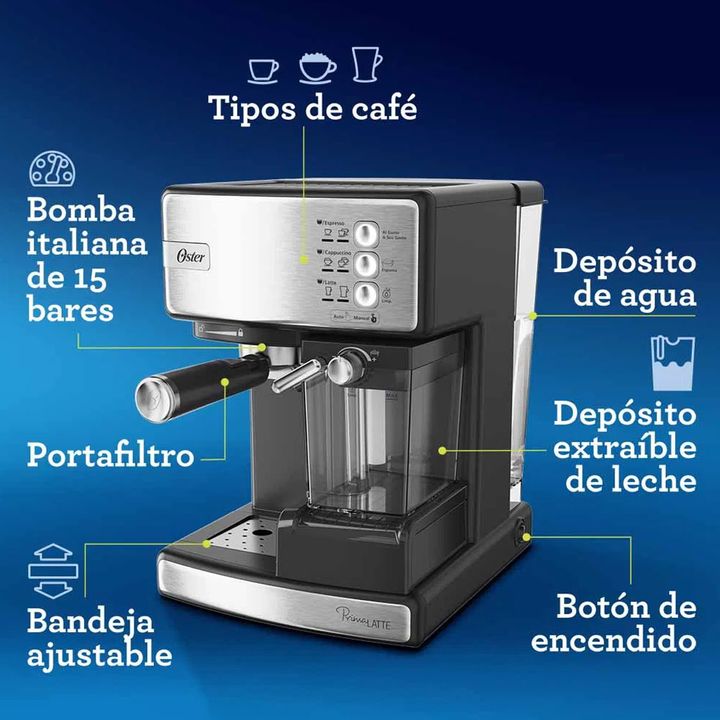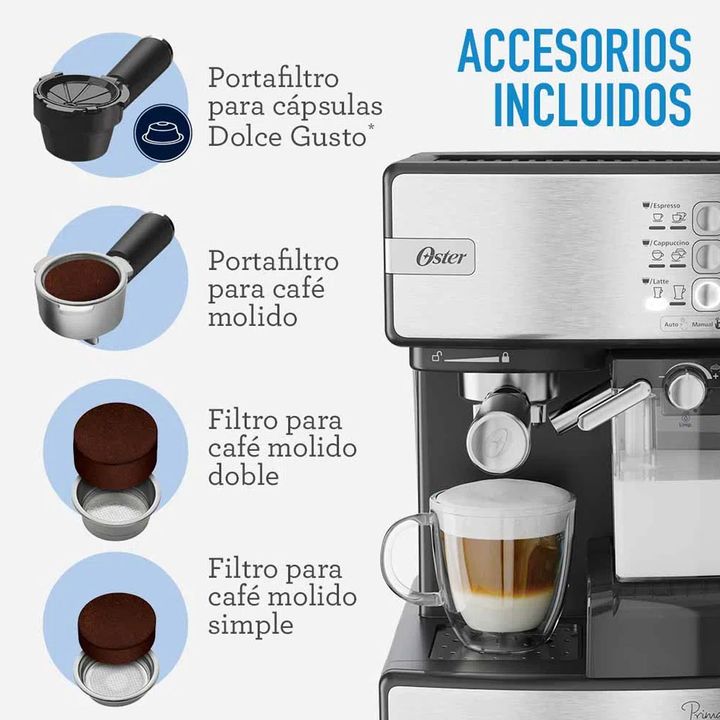 LA EXPERIENCIA DE UN CAFÉ ESPRESSO DE ALTA CALIDAD AL TOQUE DE UN BOTÓN Vive la experiencia de un café auténtico y delicioso que ofrece la cafetera automática de espresso Oster® PrimaLatte™. Todo al toque de un botón. Prepara tus bebidas favoritas utilizando tu marca predilecta de café molido, mient...