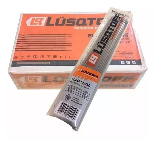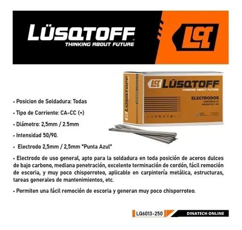 CAJA DE ELECTRODOS LUSQTOFF LQ6013-250 25KG 2.5MM INT 50/90 LQ6013-250 CARACTERÍSTICAS: •Electrodo 2.5mm / 2,5mm Punta Azul •Electrodo de uso general, apto para la soldadura en toda posición de aceros dulces de bajo carbono, mediana penetración, excelente terminación de cordon, facil remoción de esc...