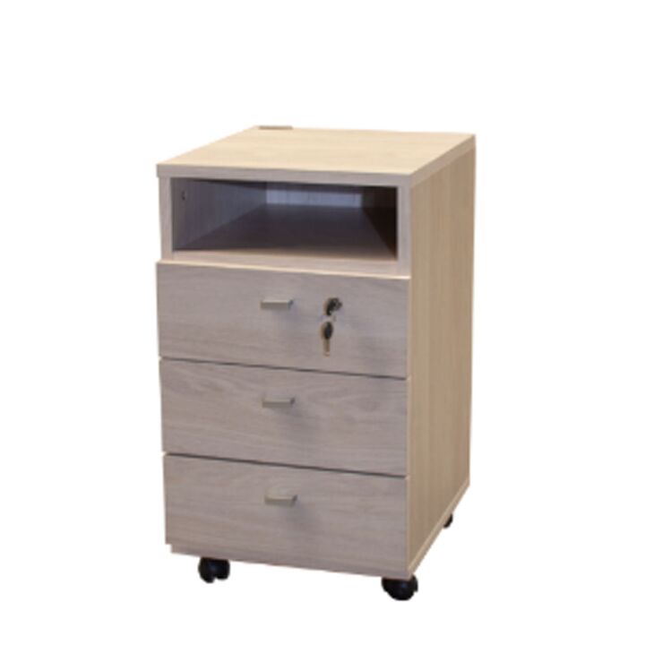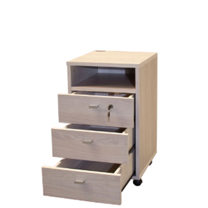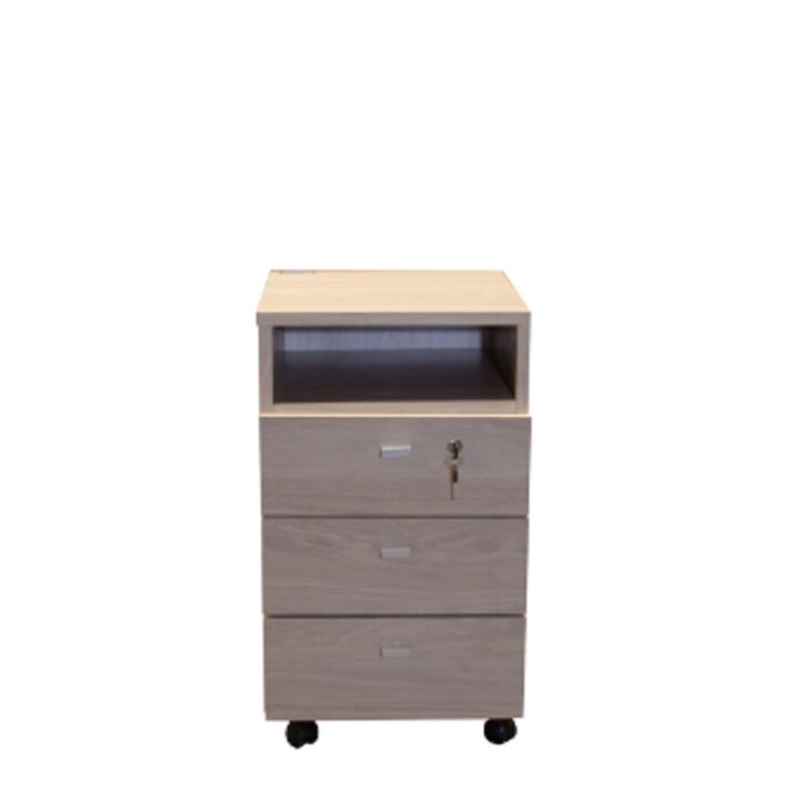 Cajonera Profesional de melamina. Complemento de la Línea Profesional. Tres cajones con correderas telescópicas, uno de ellos con cerradura. Un estante superior. Cuatro ruedas que permiten su traslado. Color Gris Andino Medidas: Ancho: 0.37 mts. Alto: 0.64 mts. Profundidad: 0.43 mts.