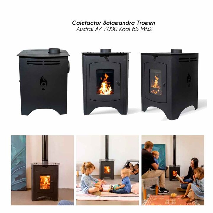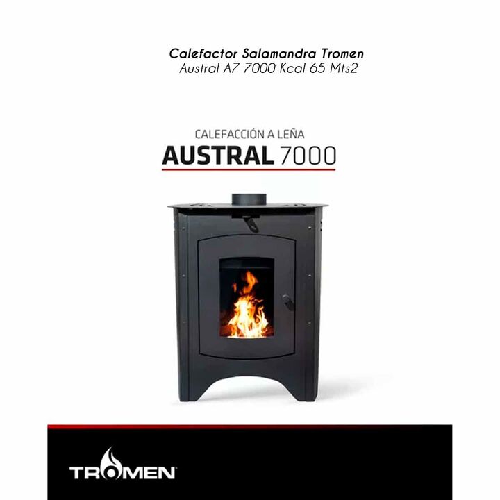 CALEFACTOR SALAMANDRA TROMEN AUSTRAL A7 7000 KCAL 65 MTS2 Marca:Tromen Código: 01-000-093T CALEFACTOR A LEÑA Toda la fuerza del fuego, en un calefactor accesible Potencia: 7.000 KCAL/H AMBIENTE A CLIMATIZAR: Hasta 65 mt2 Dimensiones: ANCHO(CM): 44 ALTO(CM): 54 PROFUNDIDAD (CM): 41.3 . PESO(KG): Cara...