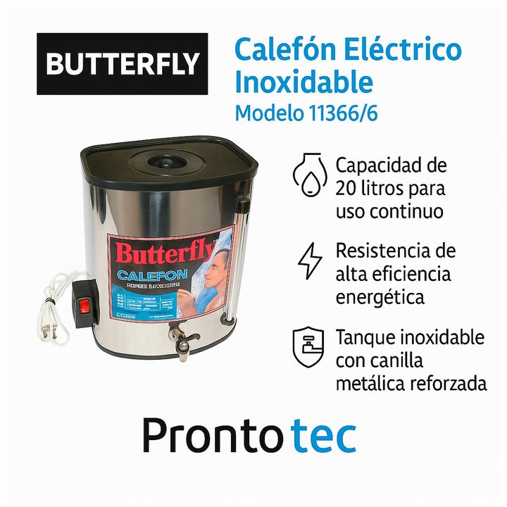 CALEFON BUTTERFLY 20 LTS ACERO INOX GRIFO BRONCE APROBADO CARACTERÍSTICAS: - Marca: BUTTERFLY -Capacidad en volumen 20 L -Potencia 1200 w -Condición del ítem Nuevo -Tipo de calefón Pared Electrico -Tipo de encendido Manual -Medidas: 33.5 cm x 32 cm x 23 cm -Material: acero inoxidable -Llave para reg...