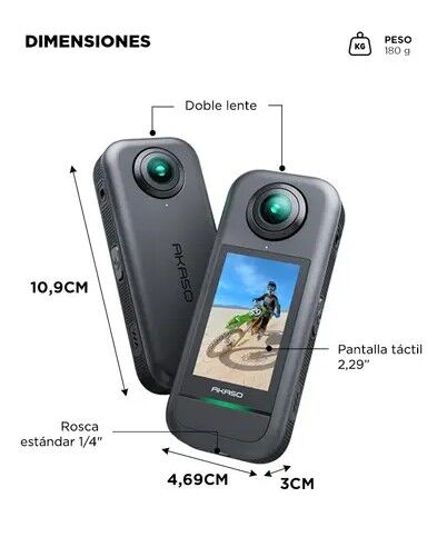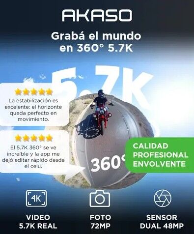 Video 360° en resolución 5.7K real: La Cámara de Acción AKASO 360 captura imágenes envolventes con máxima definición y nitidez. Ideal para deportes, viajes y contenido inmersivo profesional. Estabilización avanzada Horizon Steady: Mantiene el horizonte nivelado incluso en movimientos extremos. Perfe...