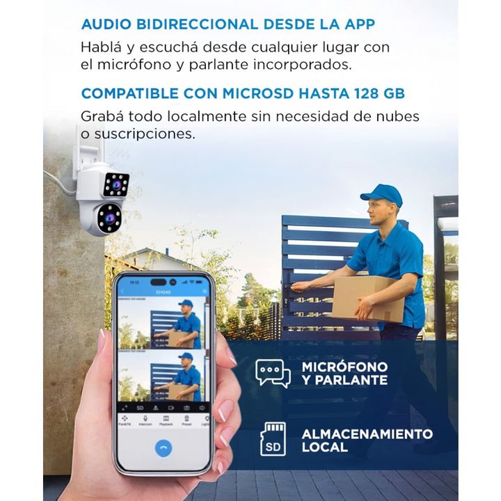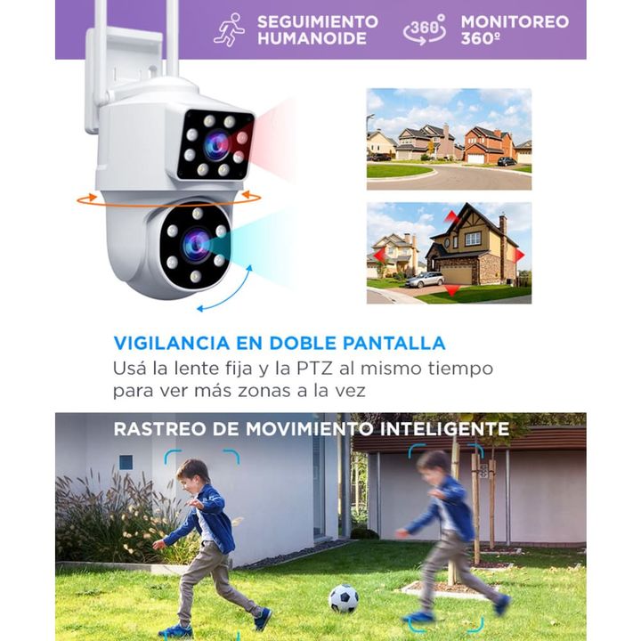 Monitoreo inteligente con doble lente: Visualizá más áreas en simultáneo gracias a su sistema de cámara dual (fija + PTZ). Evitá puntos ciegos y controlá toda la escena desde una sola app. Seguimiento automático con detección humana: La cámara identifica movimiento humano y sigue su trayectoria de f...