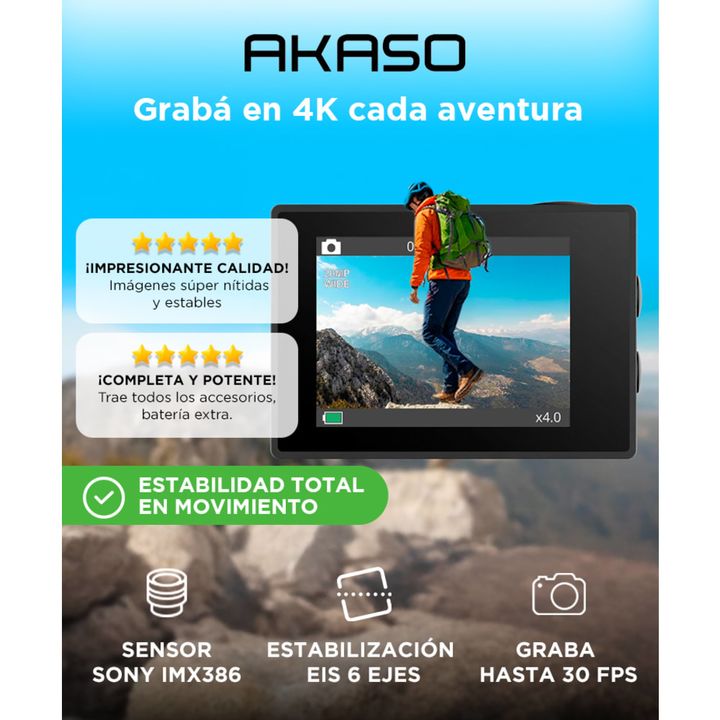 Tu mejor opción para registrar experiencias inolvidables. No importa tu destino, llevala en todos tus viajes. En la playa o en la montaña, en familia o con tu gente cercana, grabá cada momento. Con tu cámara de video Akaso V50X, también podrás crear contenido para publicar en tus redes con la mejor ...