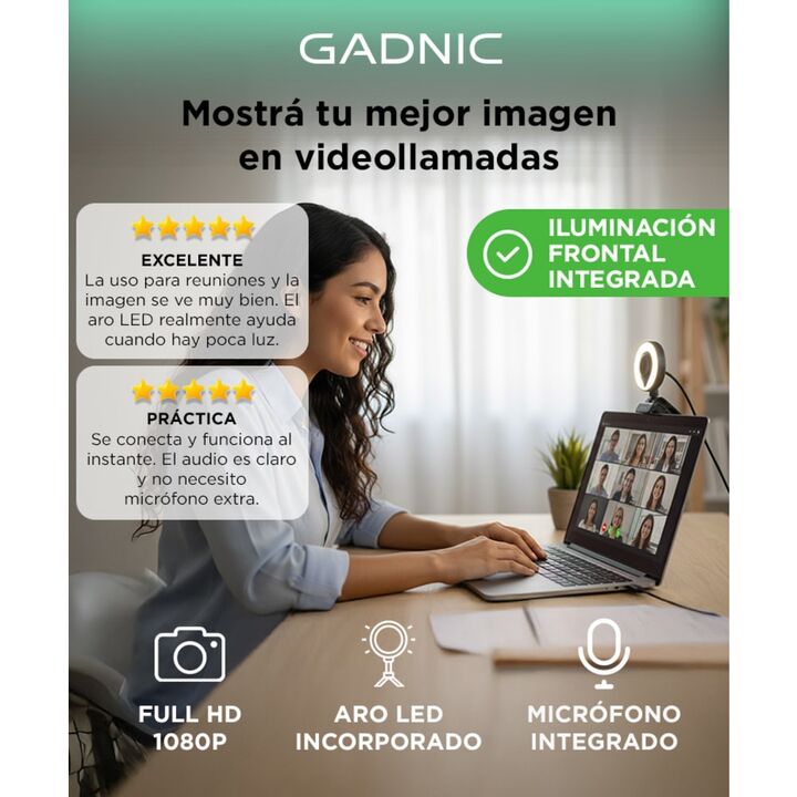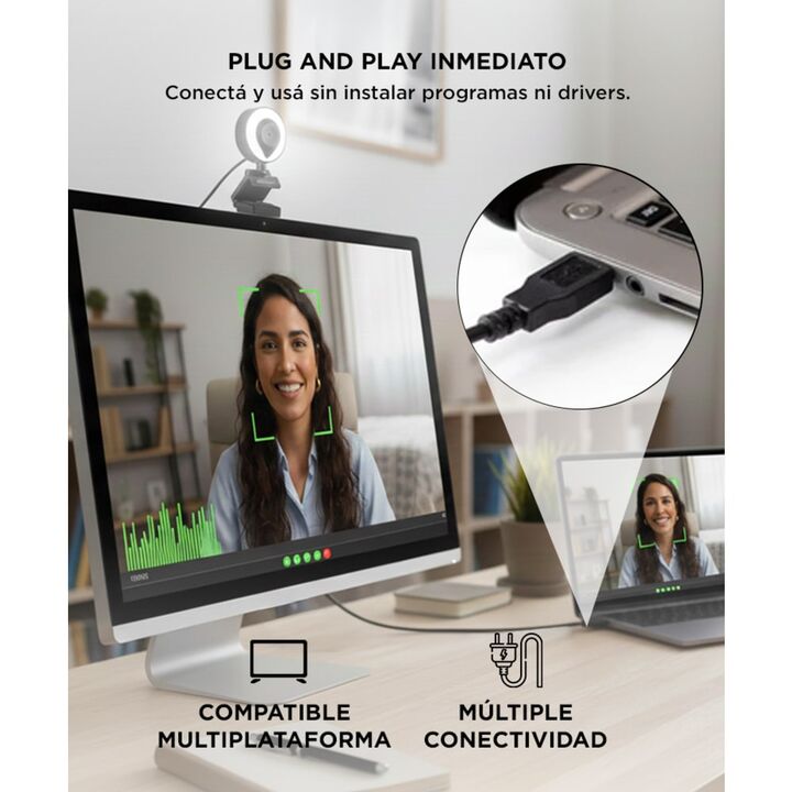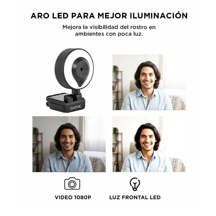 Resolución La cámara tiene una resolución de 1920 x 1080, la cual brinda una excelente calidad de imagen y nitidez siempre que la utilices. Micrófono y Luz Led Incorporada Inicia tus clases virtuales, streaming o video conferencias sin necesidad de más accesorios. Con su micrófono incorporado reprod...