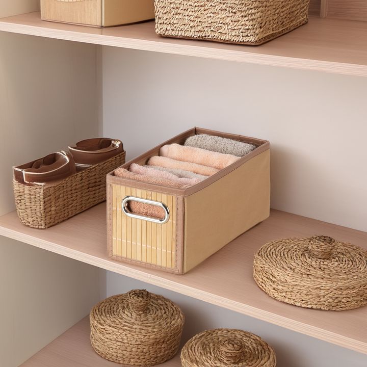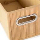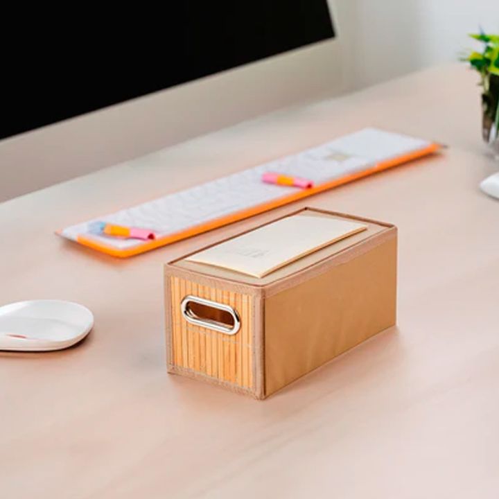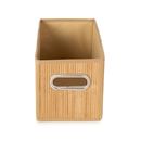 Canasto plegable de tela en lateral y frente en madera Bambu con agarre en metal Medidas : 31 x 15 x 15 cms Material : Polypropilene non wooven y varillas en madera bambu al frente. Agarre del frente en metal e interior de carton. No es aconsejable para productos pesados ya que la base como los late...