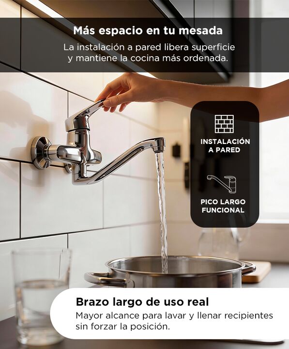 DISEÑO FUNCIONAL PARA COCINA Esta canilla Gadnic esta pensada para facilitar las tareas diarias en la cocina El formato de brazo largo mejora el alcance sobre la bacha Permite lavar utensilios grandes con mayor comodidad Aporta practicidad en cada uso diario CONTROL SIMPLE DE AGUA El sistema monocom...