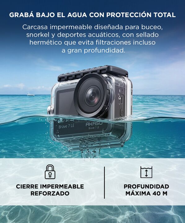 Protección total bajo el agua para tu cámara: La carcasa impermeable AKASO Brave 7 LE permite grabar y tomar fotos bajo el agua con total seguridad. Su sellado hermético protege la cámara en buceo, snorkel y actividades acuáticas. Impermeabilidad profunda para aventuras extremas: Diseñada para sopor...