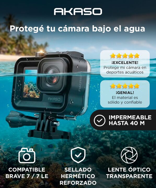 Protección total para aventuras bajo el agua: La carcasa impermeable Akaso Brave 7 permite grabar videos y tomar fotos bajo el agua con total seguridad. Su diseño sellado protege la cámara contra filtraciones incluso a grandes profundidades. Impermeabilidad hasta 40 metros: Diseñada para deportes ac...