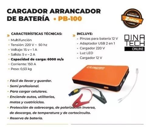 Cargador Arrancador Bateria Auto Moto Lusqtoff Pb-100 150A Modelo: PB-100 - Ideal para tener en el auto y/o casa, y salvar cualquier emergencia. - Cargador y arrancador de autos y motos. - Carga todo tipo de equipos electrónicos con interfase USB o Micro USB. - Celulares, tablet, cámaras de fotos, G...