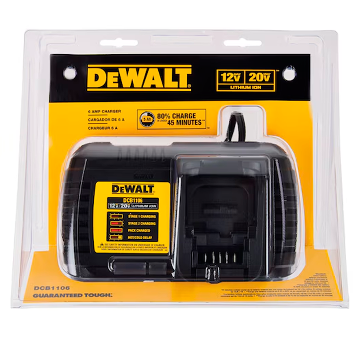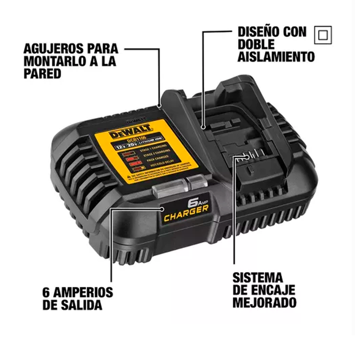 DeWALT CARGADOR 6A 220V/CN MODELO: DCB1106-AR Cargue sus baterías DEWALT 12V MAX*, DEWALT 20V MAX* y FLEXVOLT con este cargador rápido de 6 amperios. Este cargador tiene un indicador LED de estado de carga de dos etapas que muestra cuando está completamente cargado para mantener su productividad en ...