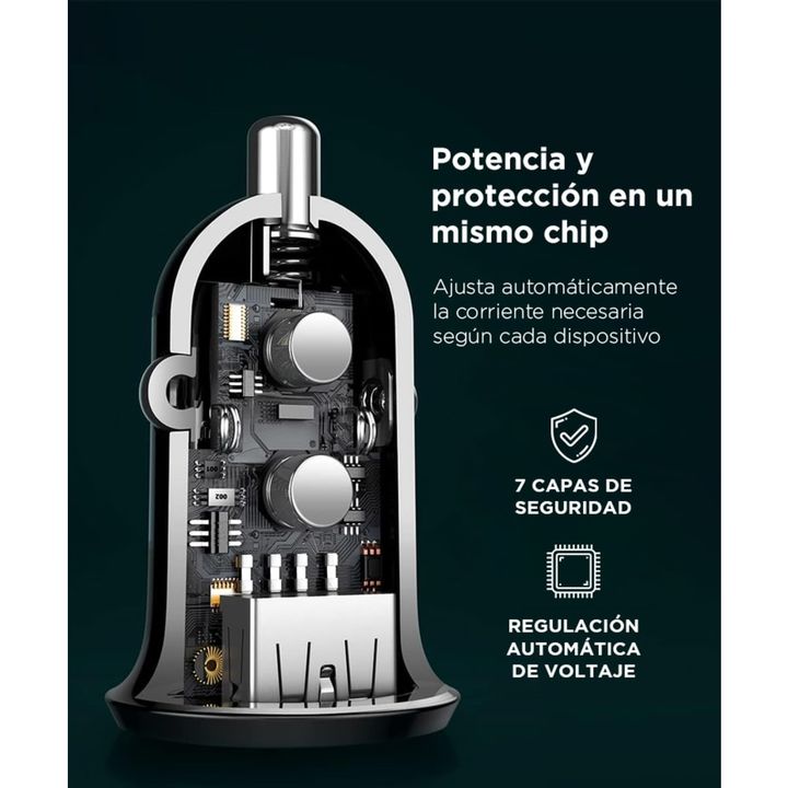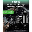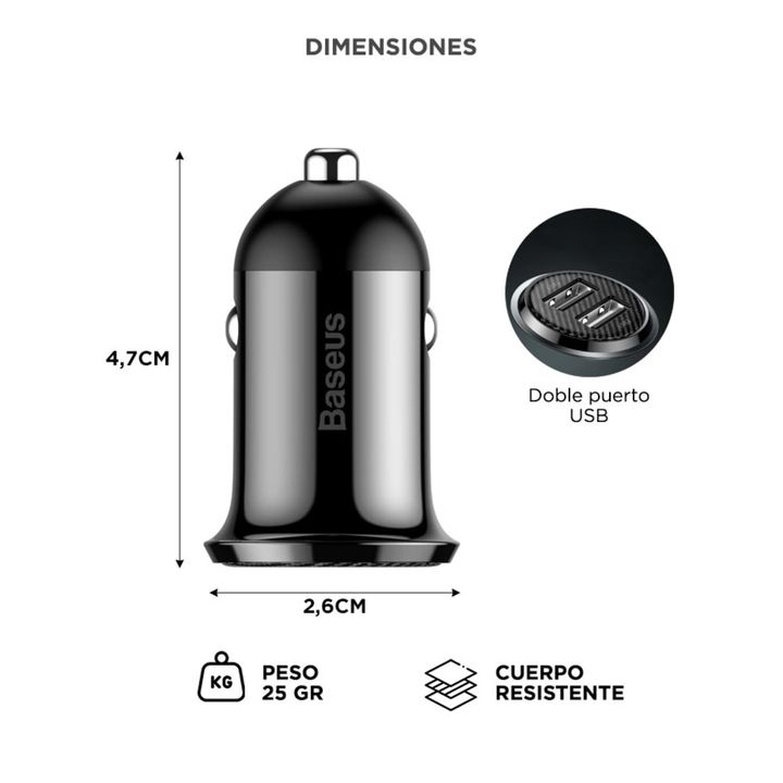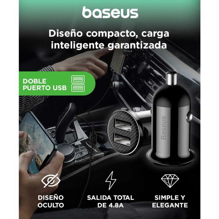 Carga rápida y segura en todo momento El Baseus Grain Pro Car Charger ofrece 2 puertos USB con una salida total de 4.8A para cargar simultáneamente tus dispositivos. Perfecto para smartphones, tablets, GPS, auriculares y más. Diseño compacto y resistente Fabricado con materiales ignífugos de alta ca...