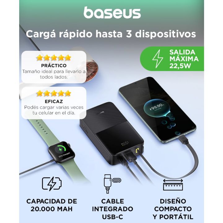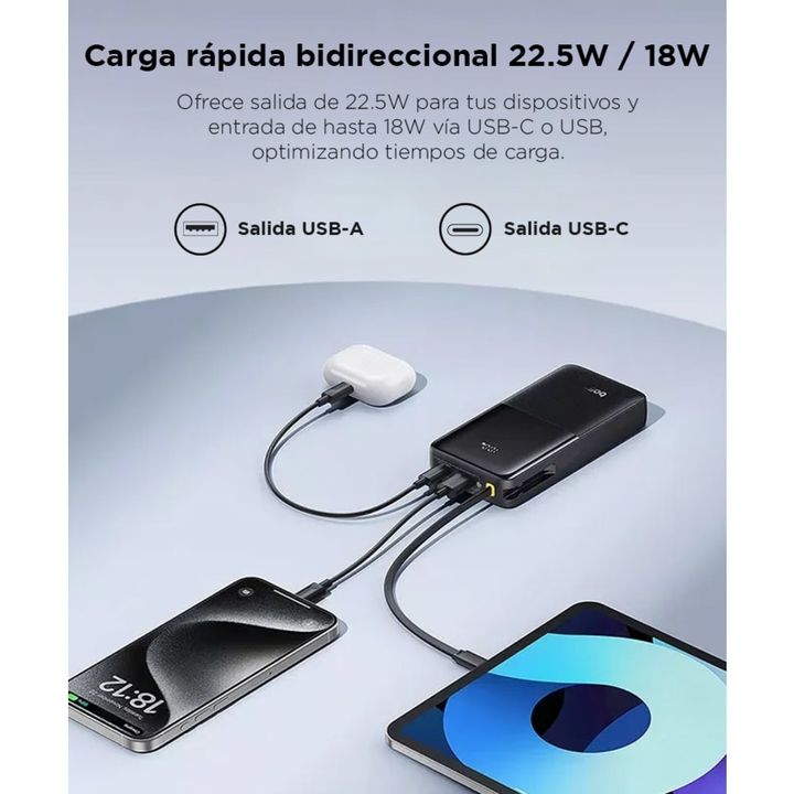 Carga rápida bidireccional: Potencia real con salida de hasta 22.5?W para dispositivos compatibles con PD y QC, y entrada rápida de hasta 18?W vía USB-C o USB. Ideal para quienes necesitan energía sin demoras. Mayor capacidad: 20.000?mAh reales: Cargá tu celular hasta 4 veces o múltiples dispositivo...