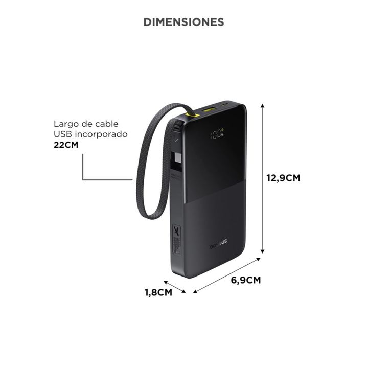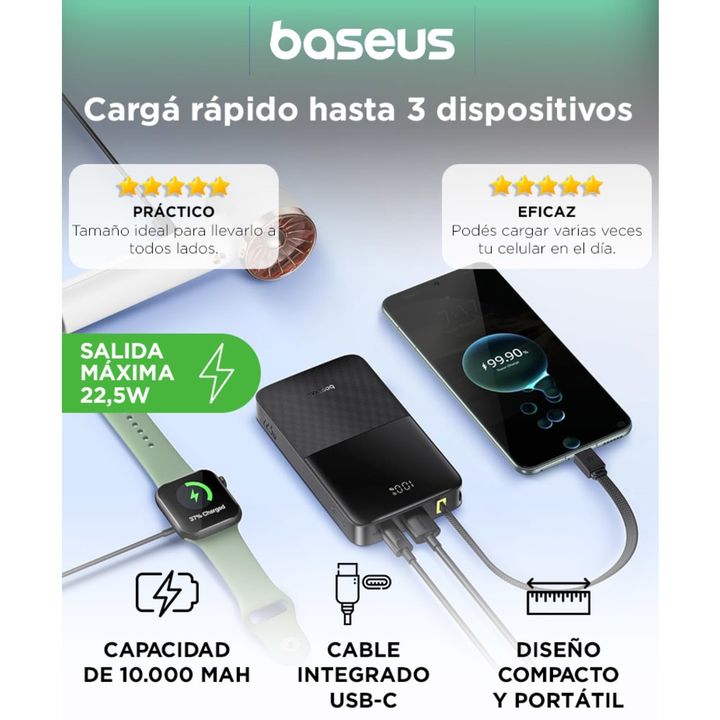 Carga rápida bidireccional: Disfrutá velocidad real con salida de hasta 22.5W compatible con protocolos PD y QC, y entrada rápida USB-C o USB de hasta 18W. Recargá el powerbank o tus dispositivos en menos tiempo. Capacidad real de 10.000mAh: Energía suficiente para cargar tu celular hasta 2 veces, a...