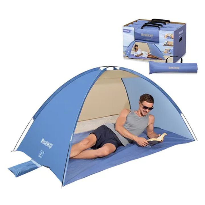 Medidas (An. x Largo x Alto): 2.00 x 1.20 x 0.95 metros. Estructura reforzada de varillas de fibra de vidrio de 8.5. Espacio para 2 personas. Tela aluminizada.