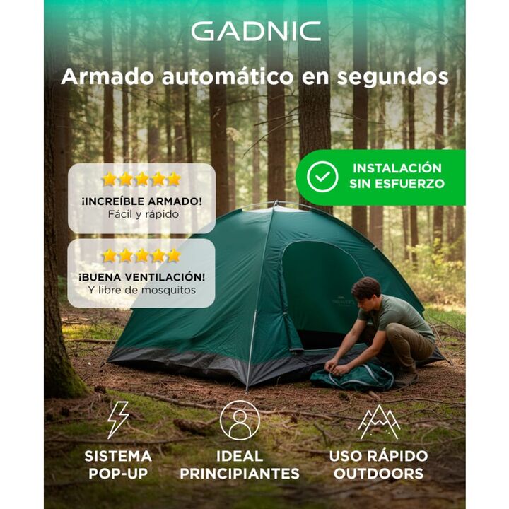Gadnic lanza su nueva línea South Port de carpas automáticas, diseñadas para que tus aventuras comiencen de manera fácil y rápida. Gracias a su innovador sistema de armado intuitivo, en solo 3 simples pasos tendrás la carpa lista para disfrutar de un momento de relax al aire libre. Construida con ma...