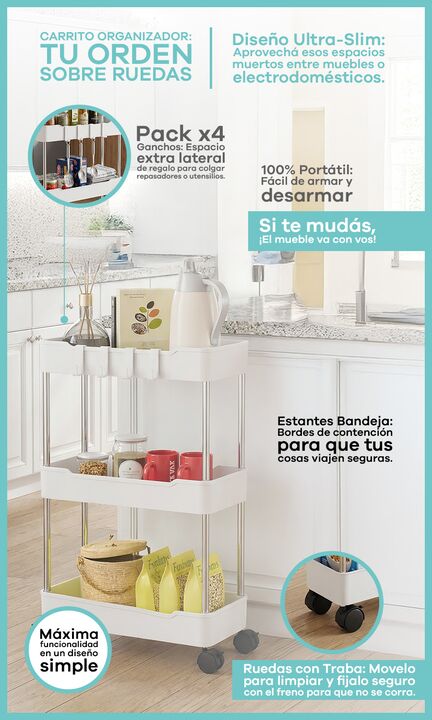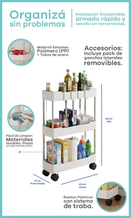 Carrito Organizador Slim 3 Niveles con Ruedas para Cocina Baño alacena Nuestro carrito organizador ultra-slim es la definición de eficiencia. Con un diseño inteligente, transforma los espacios desaprovechados entre muebles o electrodomésticos en áreas de guardado funcionales. ¿Por qué elegirlo? -100...