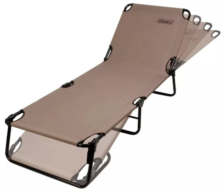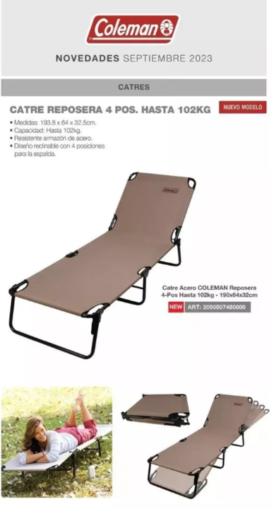 Catre Coleman Acero 102kg • Medidas: 193.8 x 64 x 32.5cm. • Medidas Plegado: 63 x 14 x 72cm. • Capacidad: Hasta 102kg. • Resistente armazón de acero. • Diseño reclinable con 4 posiciones para la espalda.