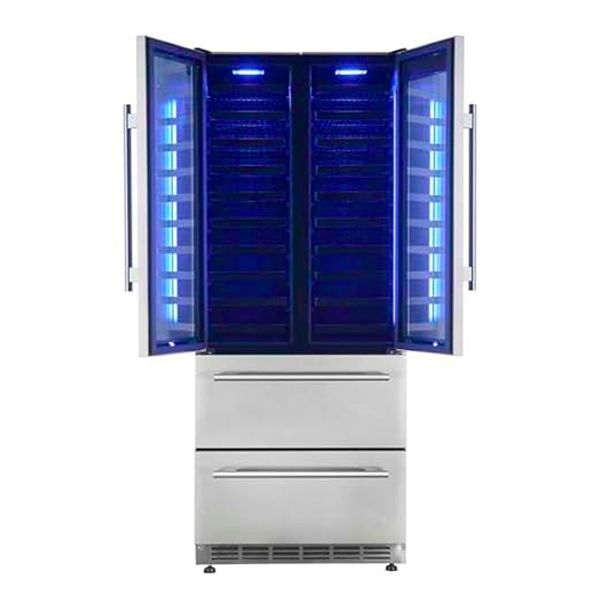ESPECIFICACIONES: Tipo: 3 Zonas 20 Bandejas Compresor: 3-18°C Luz interior Zona: Triple Tipo de clima: SN/ST/N Capacidad: 600L Refrigerante: R600a Potencia nominal: 150W Botellas: 120 botellas y 169 latas Estantes: 20 estantes de madera Rango de temperatura: Izquierda y derecha: 5-22 °C (41-72 °F) I...