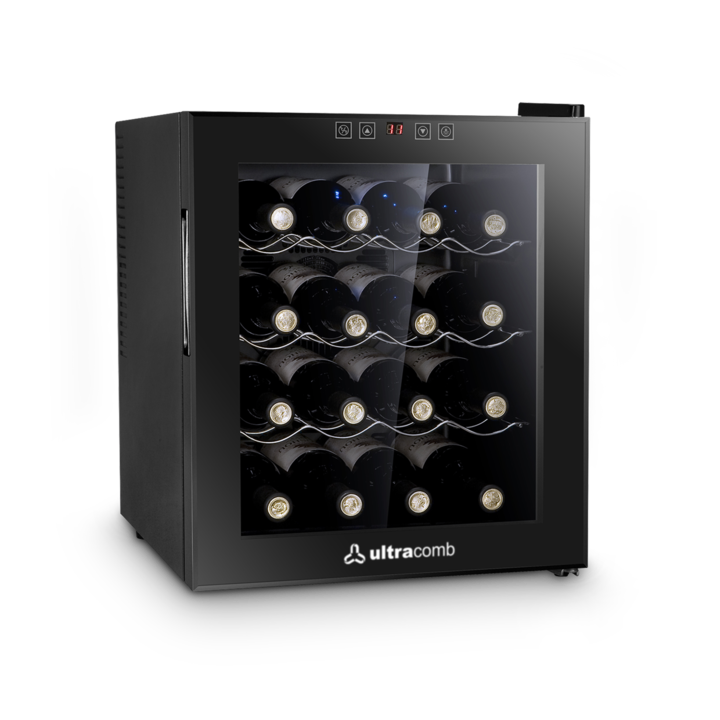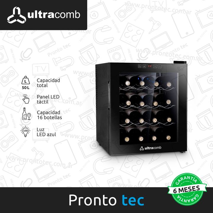 CARACTERÍSTICAS: - Marca: Ultracomb - Modelo: CV-6016 - Potencia: 70 W - Capacidad: 50 Lt (16 botellas) - Rango de temperatura: 11 - 18 °C - Material: Acero - Luz: LED azul - Display: LED táctil - Puerta: Doble vidrio templado - Rejillas: 3 - Dimensiones (An x Al x Pr): 43 x 48 x 51 cm - Peso: 14 Kg...
