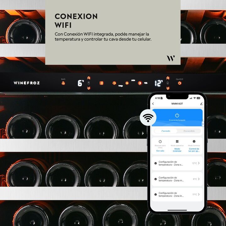 Cava de Vino Winefroz 119 Botellas WMN143T Producto: Cava Winefroz WiFi Luxury Edition Capacidad: 119 botellas Marca: Winefroz Modelo: WiFi Luxury Edition Tipo: Vinoteca eléctrica Capacidad total: 119 botellas (750 ml estándar) Especificaciones técnicas Sistema de enfriamiento: Compresor Control de ...