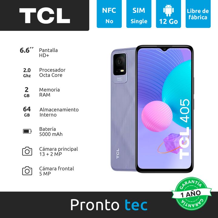 CARACTERÍSTICAS: - Marca: TCL - Modelo: 405 - Pantalla: 6,6 HD+ - Tecnología de pantalla: IPS - Resolución: 720 x 1612 px - Núcleos del procesador: 8 - GPU: Octa-core MTK A53 (4x 2.0 Ghz - 4x 1.5 Ghz) - Memoria: 2 GB - Almacenamiento: 64 GB - Lector de tarjetas de memoria: Si, Micro SD hasta 512 GB ...