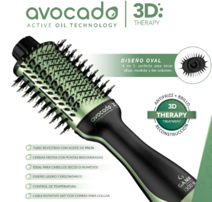 CEPILLO MODELADOR 3D MY AVOCADO POWER GAMA - Diseño oval - 4 en 1 (perfecto para secar, alisar, modelar y dar volumen), avocado - 1300 w - 3 temperaturas y 3 velocidades punta fría - Bi Volt. - Aceite de avocado - Cerdas de cerámica con revestimiento de aceite de aguacate - Potencia 1 kW - Temperatu...