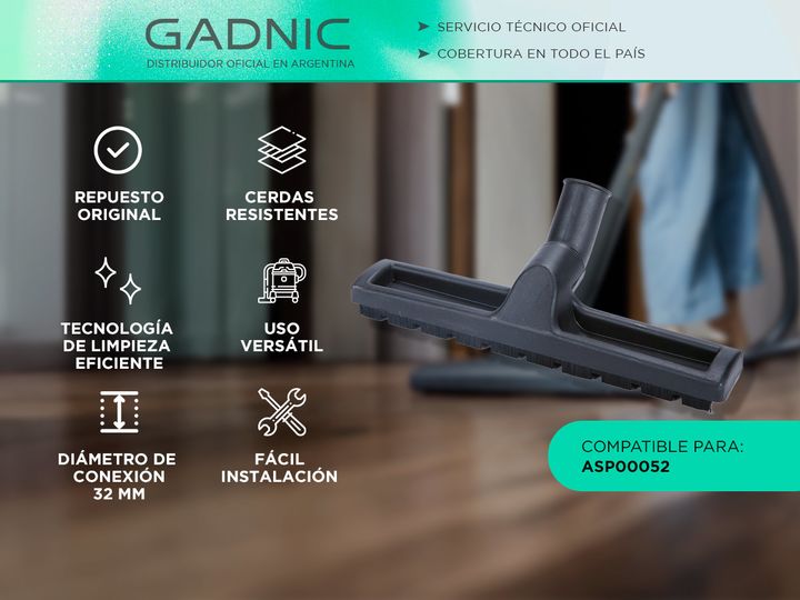 Nuevo Cepillo para Pisos Repuesto Para Aspiradoras Gadnic para ASP00052 El cepillo para pisos es la herramienta ideal para mantener tus superficies limpias y libres de polvo. Con un diseño ergonómico y resistente, es perfecto para aspiradoras con un diámetro de 32 mm, garantizando una limpieza efica...
