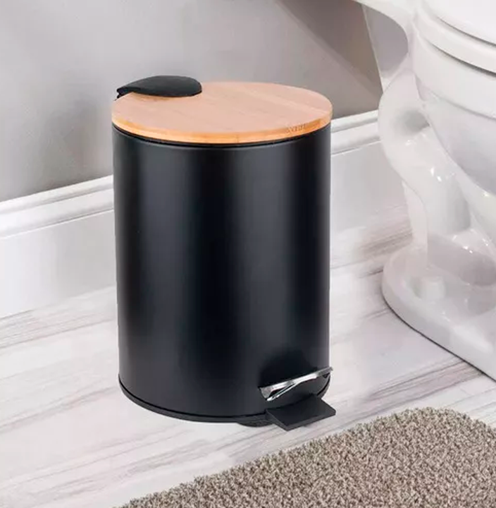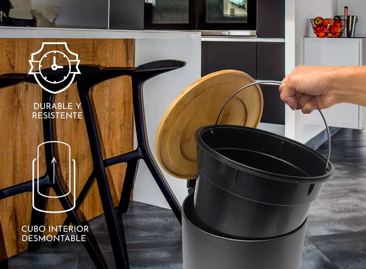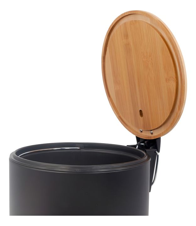 HOGAR ACTUAL CESTO DE RESIDUOS ACERO NEGRO 5 LTS C/TAPA BAMBOO SKU: 142918-N Cesto de acero negro con tapa de bambú 5 l Capacidad: 5 litros Material: Acero pintado y bambú Apertura: a pedal Con sistema de cierre suave Redondo Recubrimiento antióxido negro Acabado mate Cesto interno de plástico remov...