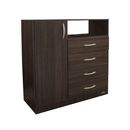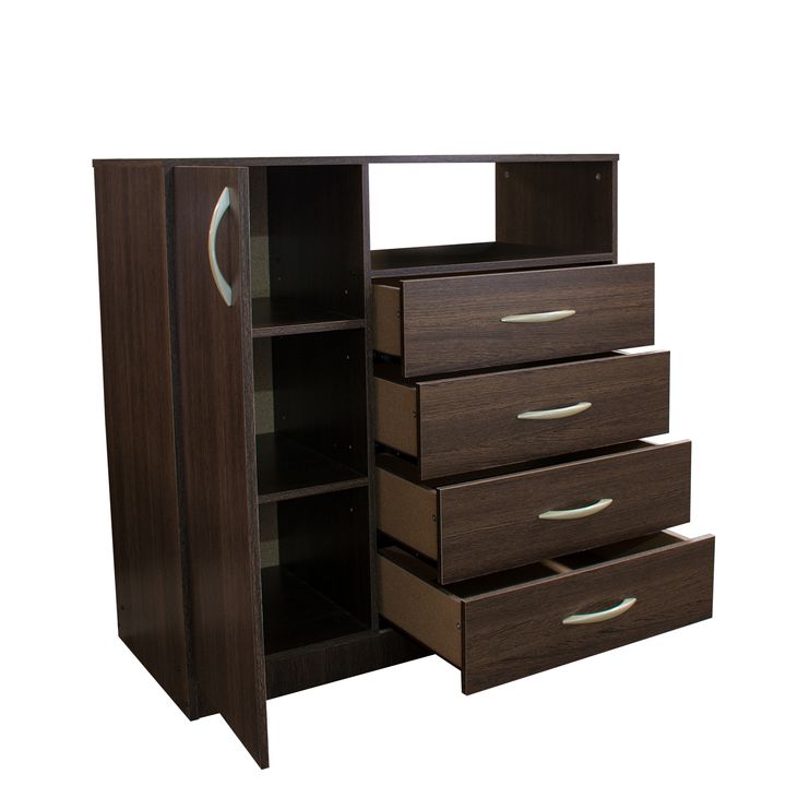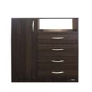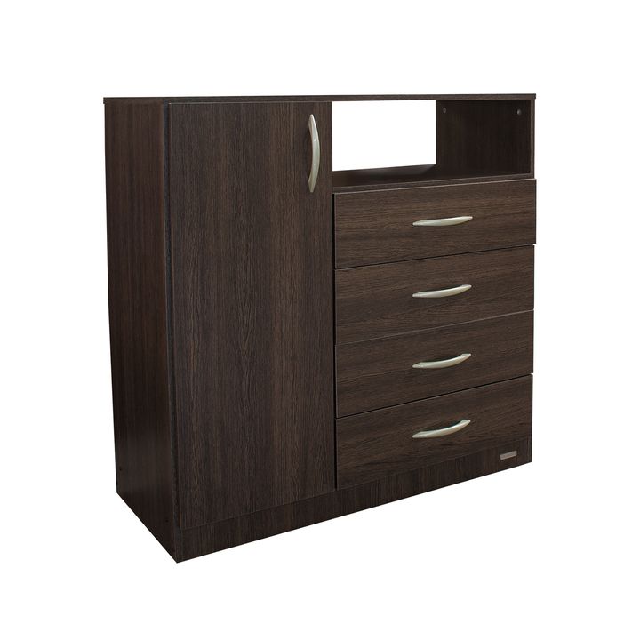 Chiffonier de melamina. Una puerta con bisagras metálicas y dos estantes móviles. Cuatro cajones con correderas metálicas. Tiradores de Pvc. Color Tabaco. Medidas: Ancho: 1.00 mts. Alto: 1.02 mts. Profundidad: 0.47 mts. Productos Seleccionado para venta y entrega “EN CAJA”.