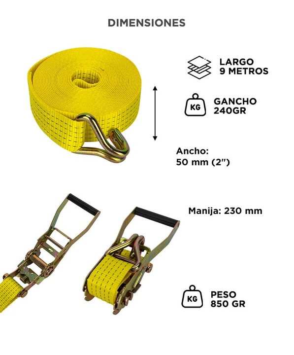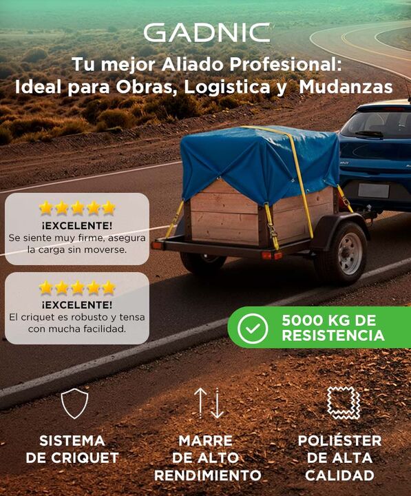 Resistencia de hasta 5000 kg fuerza de rotura: La Cinta de Amarre Tensor GADNIC ofrece seguridad profesional para cargas pesadas. Ideal para camiones, utilitarios y transporte industrial. Sistema criquet reforzado electroplateado: Permite un tensado firme y seguro, con mayor durabilidad frente al us...