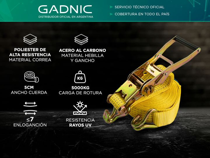 Acerca de Cinta de amarre Tensor Traca Traka Gadnic Carga 5tn Nueva Cinta de amarre Gadnic de 5tn Duradera de alta resistencia que se puede utilizar para mover carga en camiones planos, remolques o vehículos de transporte Cuenta con una correa de poliéster que resiste la biocarga, los rayos UV, el e...