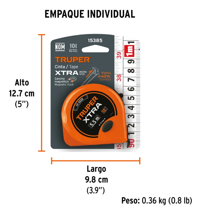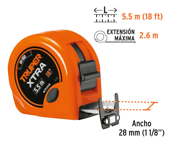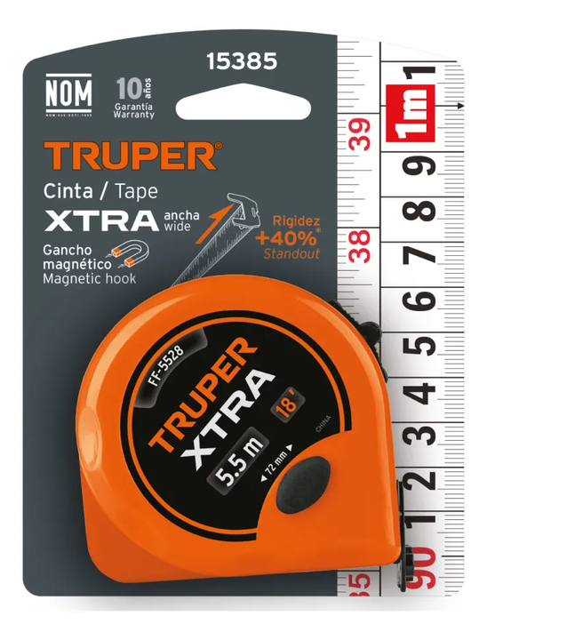 CINTA METRICA EXTRA ANCHA 5,5 MTS. TRUPER 15385 Cinta extra ancha que permite mayor extensión, impresa por ambos lados, recubierta de laca para máxima duración (Números grandes de fácil lectura / Graduación vertical y horizontal) Gancho doble magnético que facilita la medición por ambos lados Freno ...