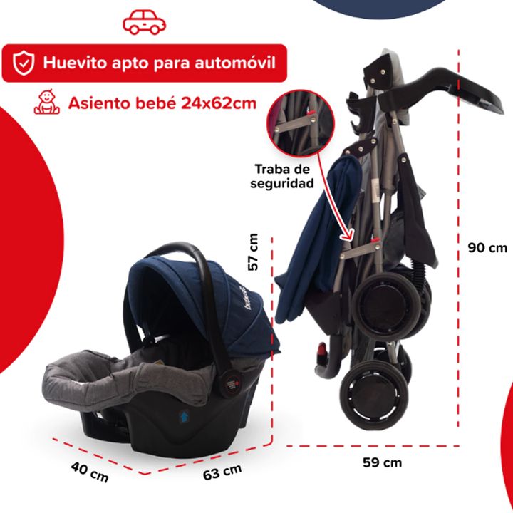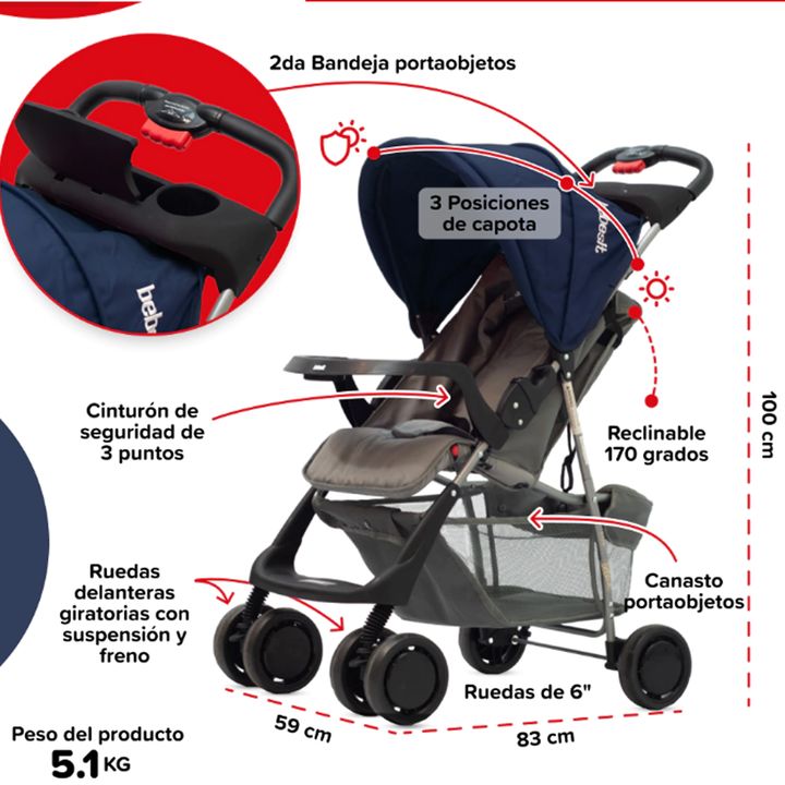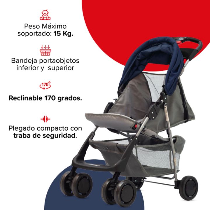 Cinturón de seguridad de 3 puntos. Reclinable en múltiples posiciones. Posapiés regulable. Capota europea de 3 posiciones. Tapizado doble acolchado. 6 ruedas de 6 pulgadas. Ruedas delanteras giratorias con suspensión y freno. 6 ruedas de 6 pulgadas. Reclinable 170 grados. Peso Máximo soportado: 15 K...