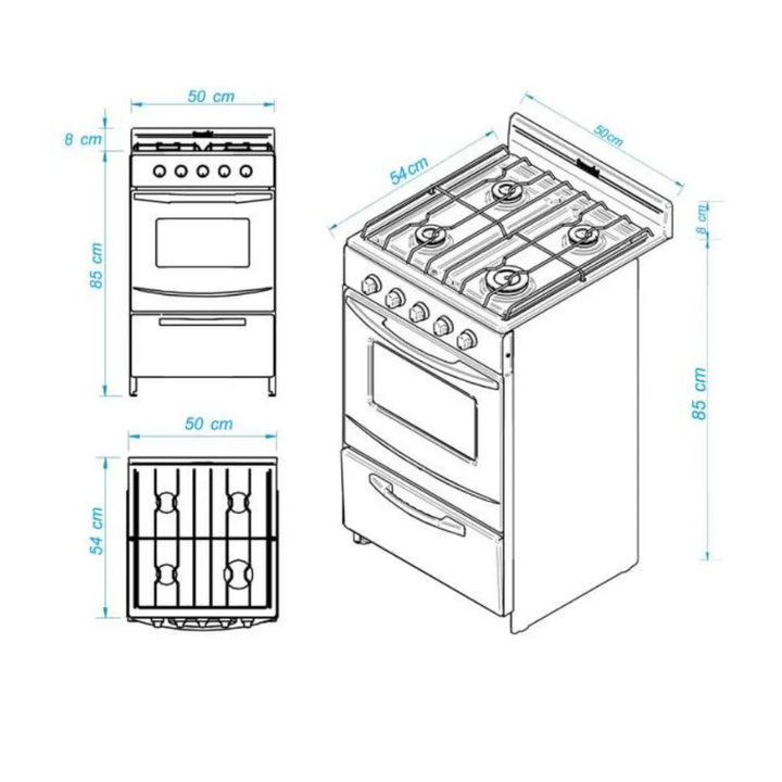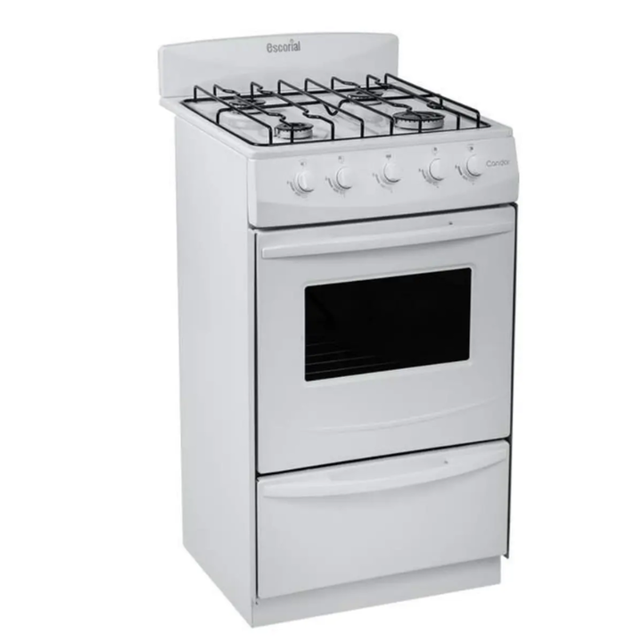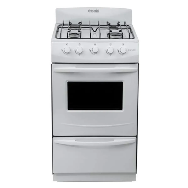 La cocina Escorial CANDOR GN totalmente enlozada en polvo electrostático. Tiene tres hornallas medianas y una grande. Con plancha, puerta de horno, puerta parrilla esmaltado color blanco; puerta de horno con bisagra desmontable, puerta parrilla rebatible, perillas de plástico inyectado, manija de pl...