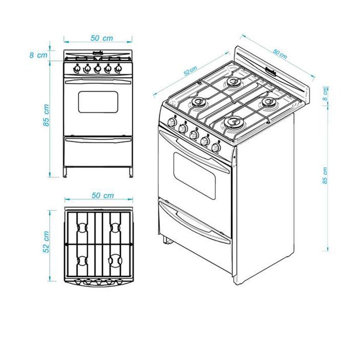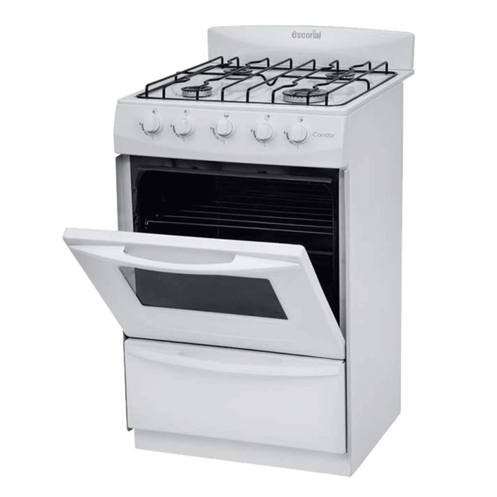 Superficies exteriores e interior del horno totalmente enlozados en polvo electrostático de fácil limpieza. 4 hornallas (3 medianas y una grande). Válvula de seguridad en hornallas y horno. Quemadores de aluminio con tapa de acero esmaltada. Respaldo extraíble. Puerta de horno con bisagra desmontabl...