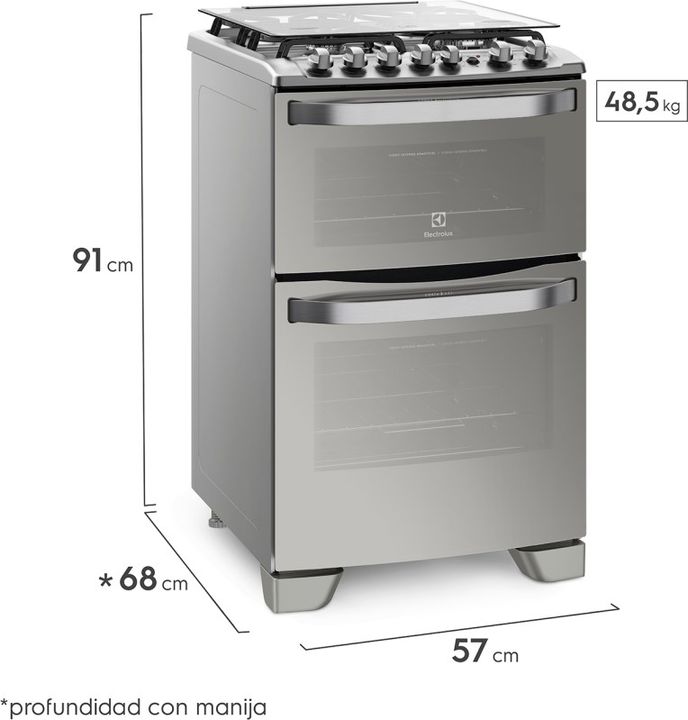 COCINA 56DXQ DOBLE HORNO 4H 56CM ELECTROLUX -Cocina Doble Horno (Eléctrico/ Gas) -56 cm de ancho -Color Acero Inoxidable -Full Glass -Triple llama -Timer -Luz interior -Encendido electrónico -Horno Easyclean y doble vidrio -Sistema abre fácil -Tapa autobalanceada -Medidas (AlxAnxProf) 91x57x68 cm -T...