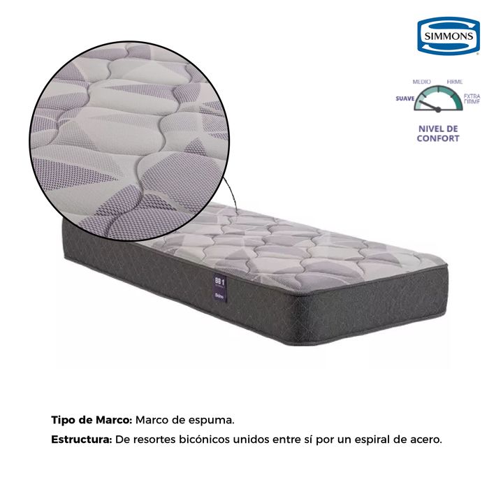 BELSPRING 1 INFORMACIÓN SOBRE LA LÍNEA La línea Belspring 1 se compone de un Colchón de Resortes con Marco de Espuma. Sus Resortes Bicónicos templados electrónicamente, unidos entre sí por un espiral de acero, conforman una estructura confortable y duradera que sostiene perfectamente el peso del cue...
