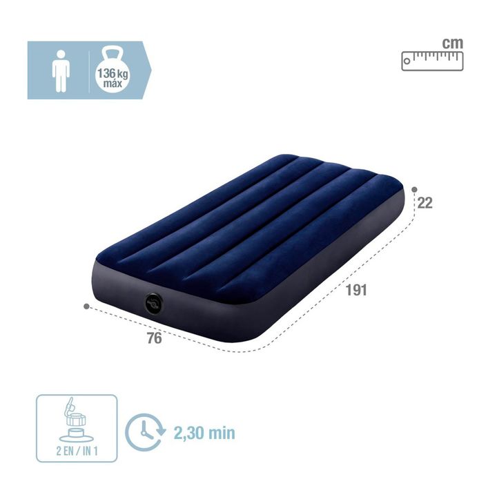COLCHON INFLABLE INTEX 76X193X22 CM JUNIOR 10640/3 ------------------------------------------------------------- - Estructura acanalada para mayor firmeza y superficie ondeada resistente al agua y que proporciona mayor suavidad al tacto - Inflado: con inflador manual o eléctrico (no incluidos) - Vál...