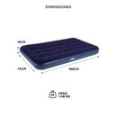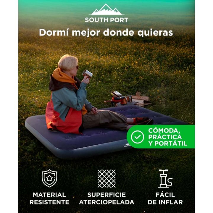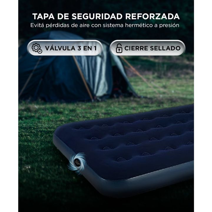 Comodidad donde la necesitás: Ideal para visitas, camping o espacios reducidos. Se adapta a cualquier ambiente con superficie acolchada y suave. Inflado rápido y seguro: Con válvula de doble capa y tapa hermética que evita pérdidas. Compatible con bomba manual o eléctrica. Diseño compacto y resisten...
