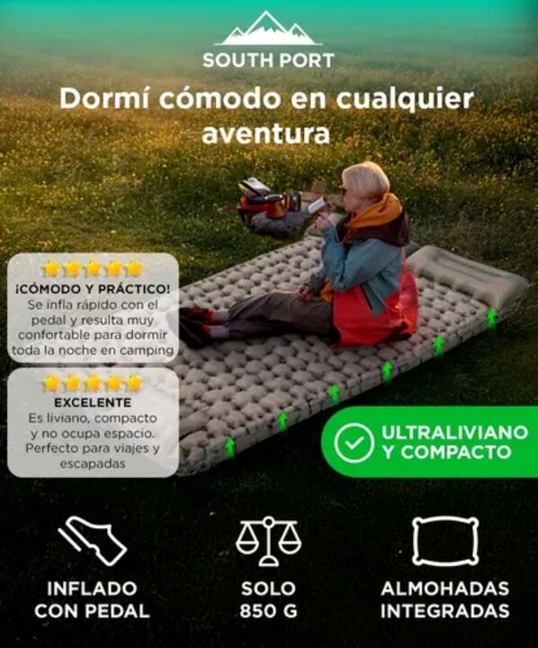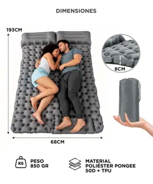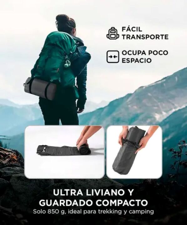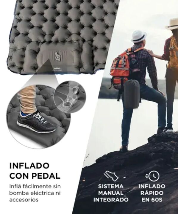 INFLADO CON PEDAL SIN BOMBA ELECTRICA El colchón inflable Gadnic incorpora un sistema de inflado manual con pedal que permite prepararlo rápidamente sin necesidad de electricidad. Ideal para camping, trekking y actividades al aire libre. DISEÑO ULTRALIVIANO PARA TRANSPORTAR SIN ESFUERZO Con un peso ...