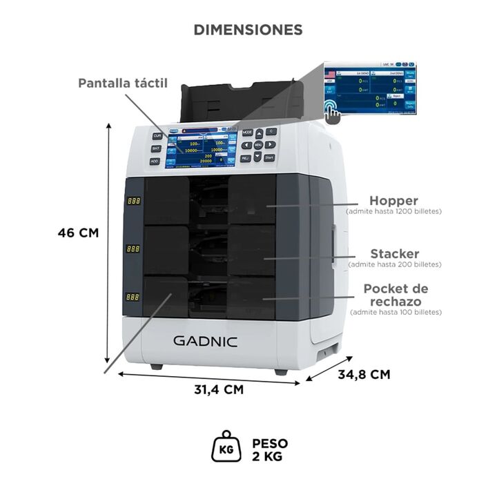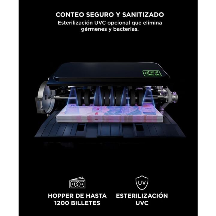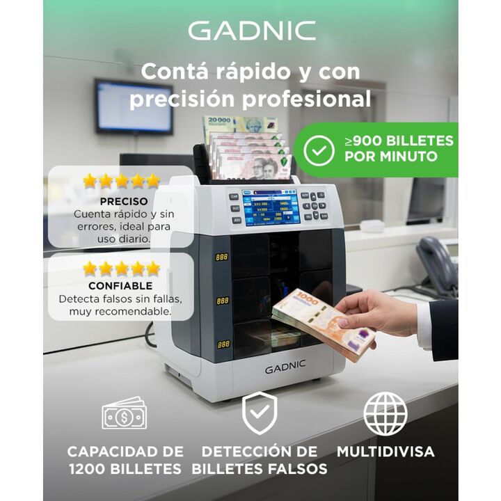 Contá más rápido, con la máxima precisión La contadora Gadnic ofrece velocidad profesional de ?900 billetes por minuto, ideal para entornos exigentes que requieren agilidad sin sacrificar exactitud. Detección avanzada de billetes falsos Equipado con sensores UV, MG, IR, MT, doble CIS y reconocimient...